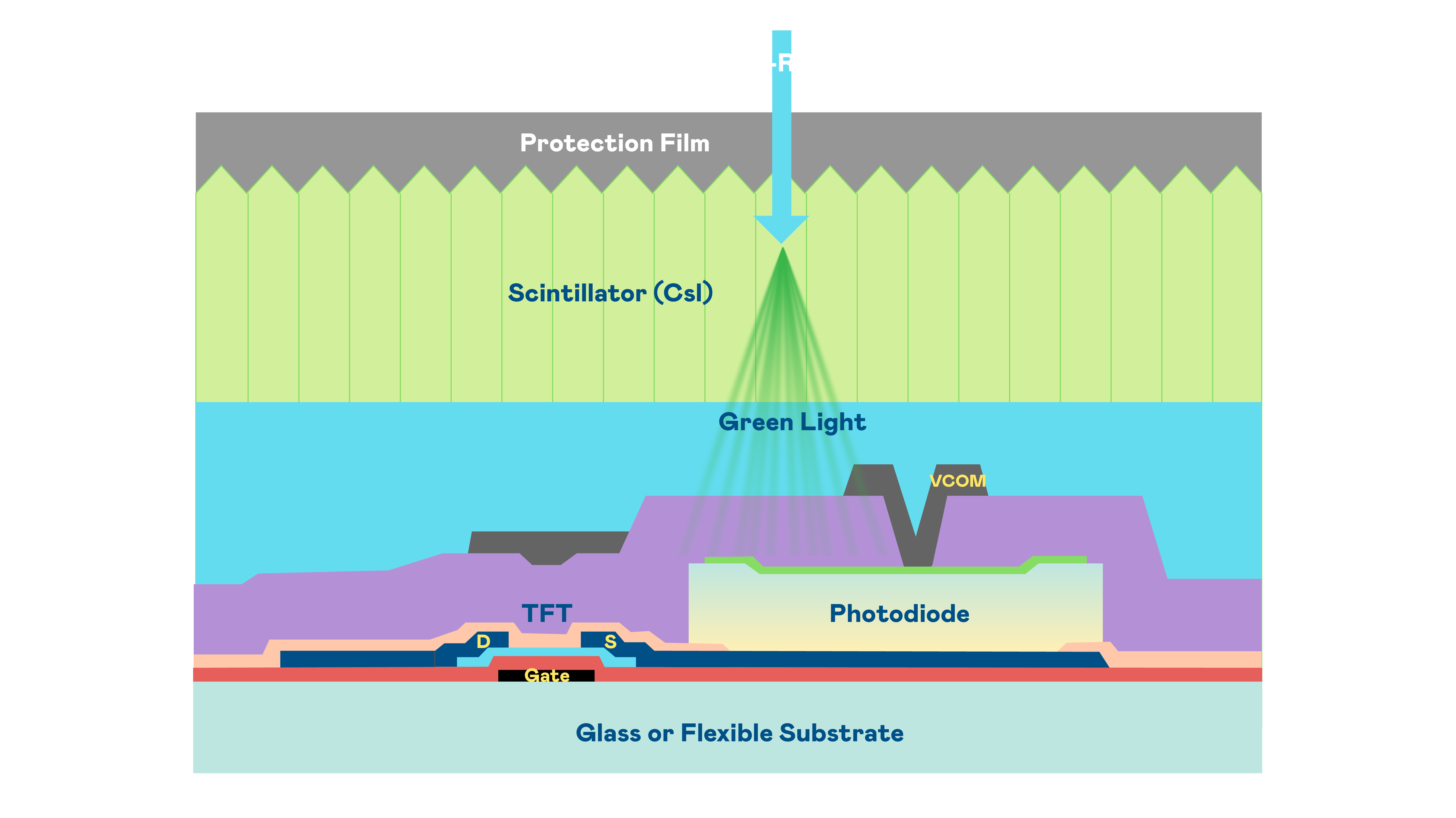 j9国际的X光影像感测阵列使用薄膜电晶体 (TFT) 作为每个像素的读取开关,搭配光电二极体(Photodiode)的光电转换元件,用以感测X光影像讯号。